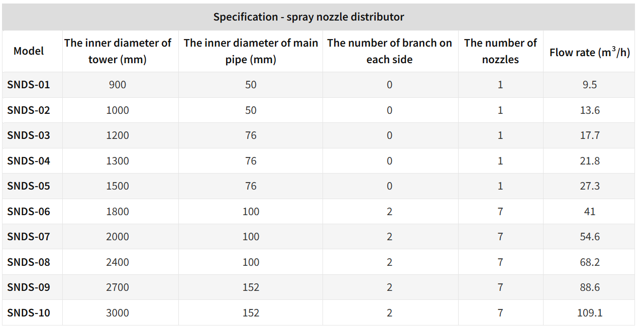 Spray Nozzle Distributor Provides Wide Airflow Channels Spray nozzle distributor with compact structure, is a popular type of distributor used in packing towers. Under the pressure, spray nozzle distributor can distribute liquid on the tower packing through nozzles. It can provide wider airflow channels and higher spraying density, thus the spraying region of spray nozzle distributor is much bigger than which of the hole tubular distributor. Features